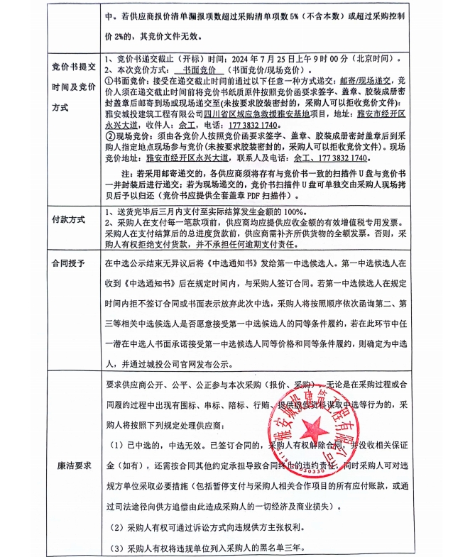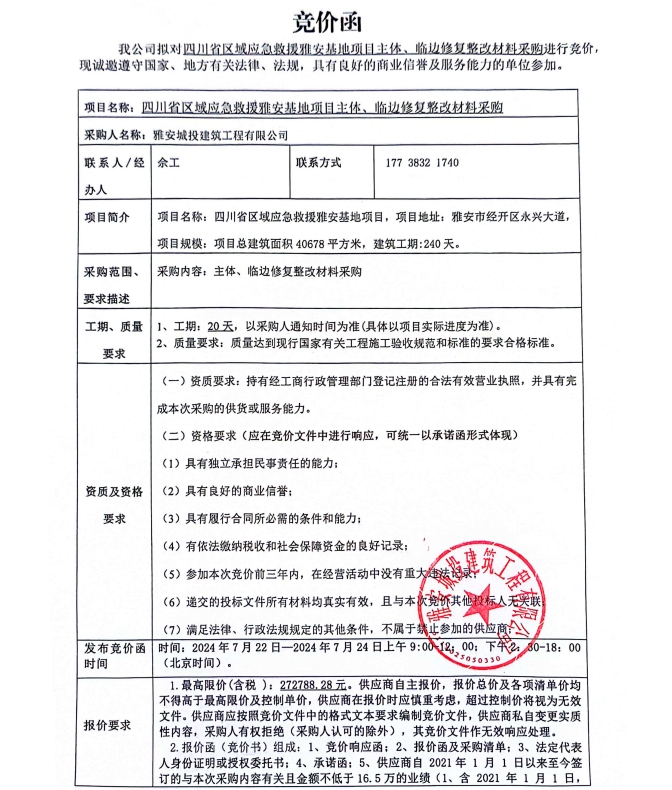 四川省區(qū)域應(yīng)急救援雅安基地項(xiàng)目主體、臨邊修復(fù)整改材料采購競價(jià)公告