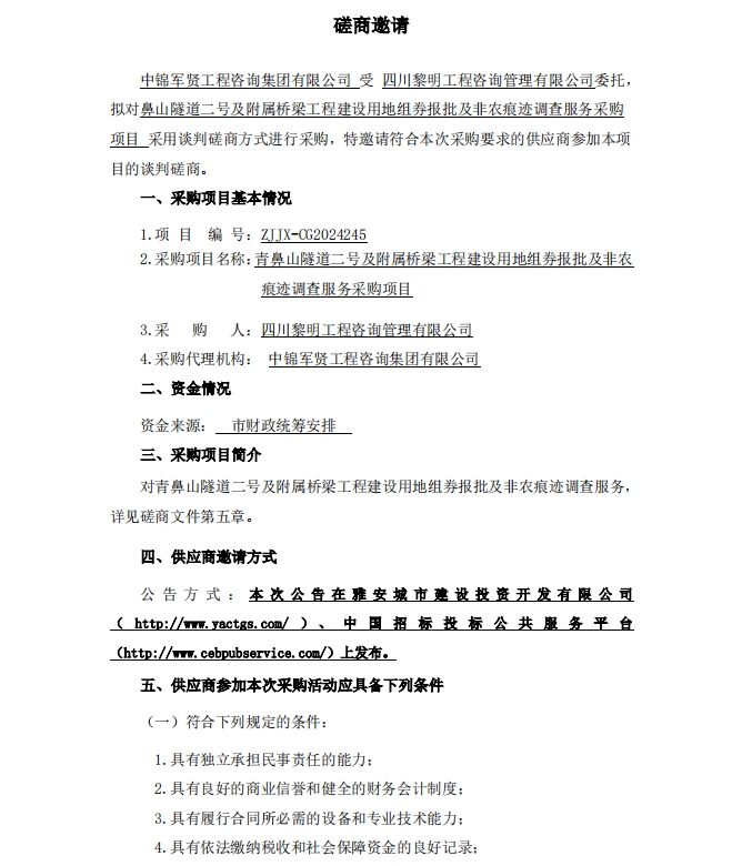 青鼻山隧道二號及附屬橋梁工程項目用地組劵報批及非農(nóng)痕跡調(diào)查服務(wù)采購項目磋商邀請公告