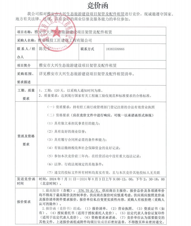 雅安市大興生態(tài)旅游建設(shè)項(xiàng)目架管及配件租賃競價(jià)公告