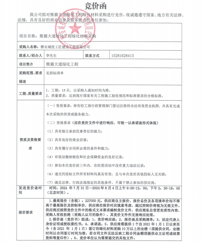 熊貓大道綠化工程綠化材料采購競價公告