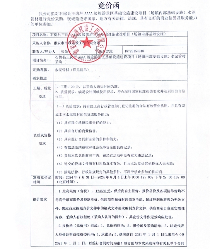 石棉縣王崗坪AAAA級旅游景區(qū)基礎設施建設項目(場鎮(zhèn)內(nèi)部基礎設施)水泥管材采購競價公告