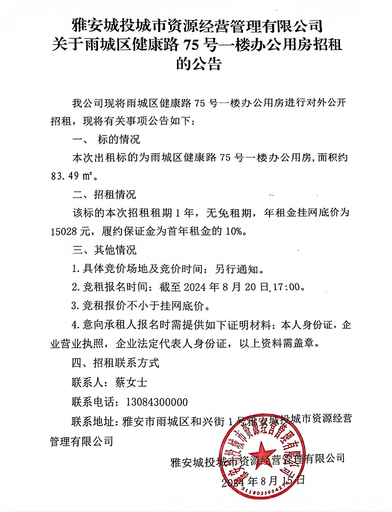 雅安城投城市資源經(jīng)營(yíng)管理有限公司關(guān)于雨城區(qū)健康路75號(hào)一樓辦公用房招租的公告