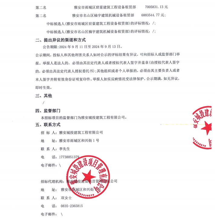 雅州印架管租賃采購項目(項目名稱)服務/標段中標候選人公示公告