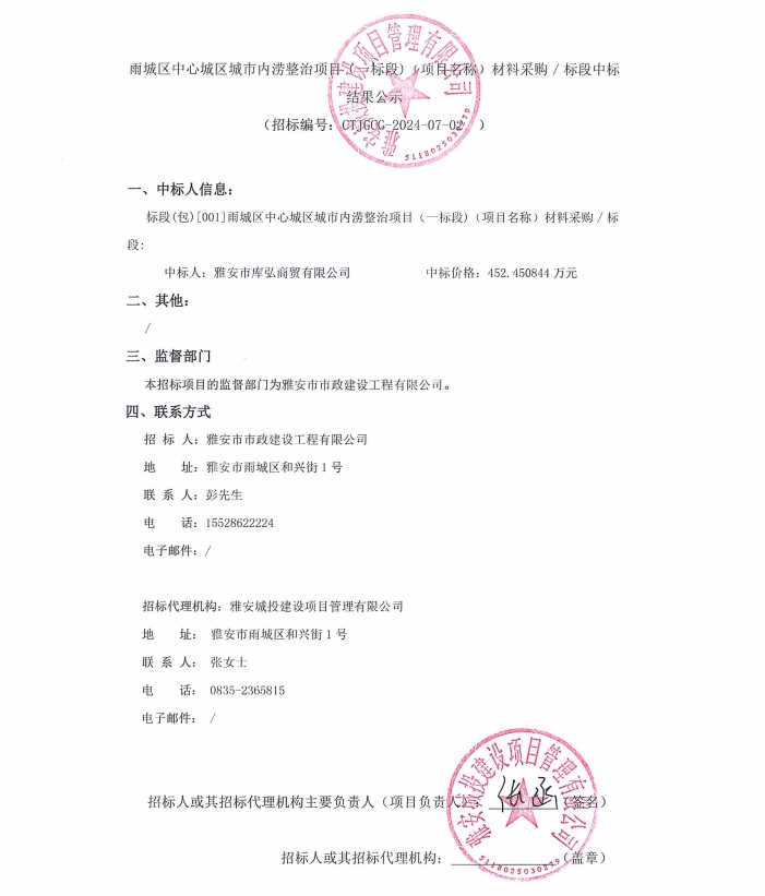 雨城區(qū)中心城區(qū)城市內(nèi)澇整治項(xiàng)目(一標(biāo)段)(項(xiàng)目名稱)材料采購/標(biāo)段中標(biāo)結(jié)果公示