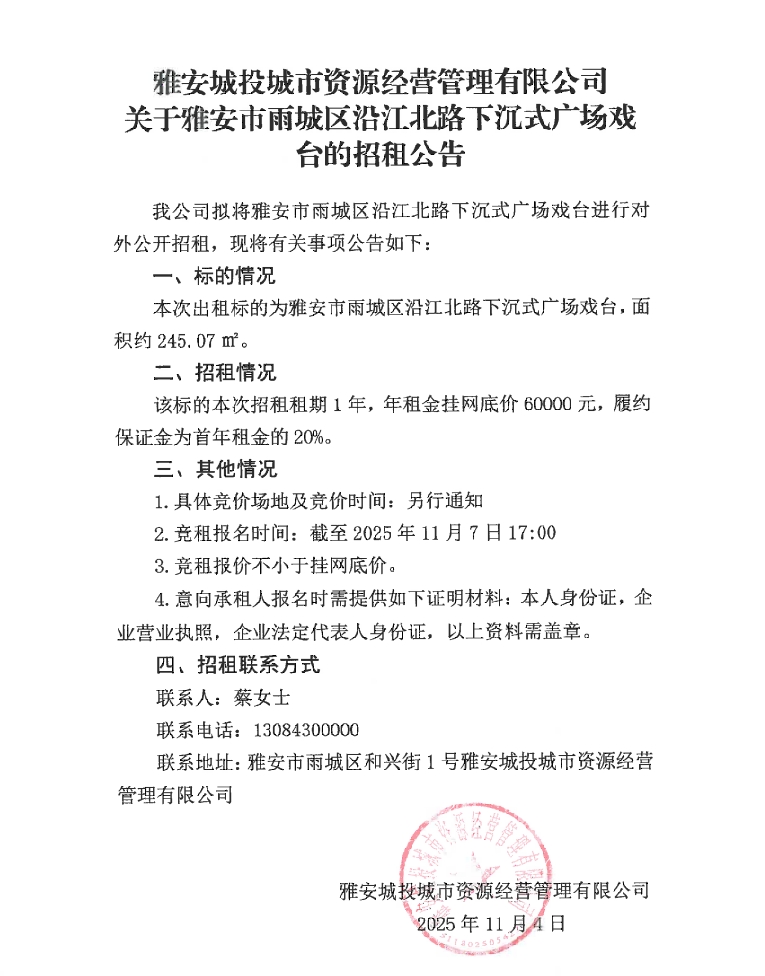 雅安城投城市資源經(jīng)營(yíng)管理有限公司關(guān)于雅安市雨城區(qū)沿江北路下沉式廣場(chǎng)戲臺(tái)的招租公告