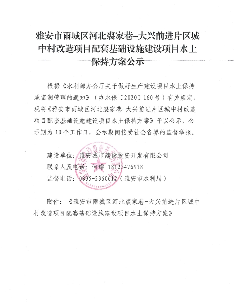 雅安市雨城區(qū)河北裘家巷-大興前進片區(qū)城中村改造項目配套基礎(chǔ)設(shè)施建設(shè)項目水土保持方案公示