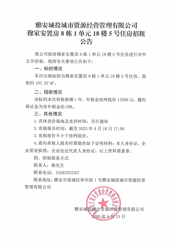 雅安城投城市資源經(jīng)營管理有限公司穆家安置房8棟1單元18樓5號(hào)住房招租公告