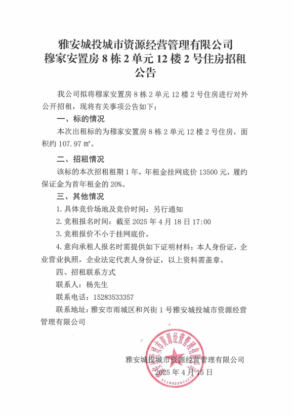 雅安城投城市資源經(jīng)營管理有限公司穆家安置房8棟2單元12樓2號(hào)住房招租公告