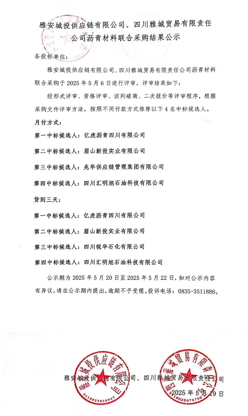 雅安城投供應(yīng)鏈有限公司、四川雅城貿(mào)易有限責(zé)任公司瀝青材料聯(lián)合采購結(jié)果公示