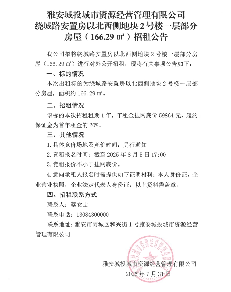 雅安城投城市資源經(jīng)營管理有限公司繞城路安置房以北西側(cè)地塊2號樓一層部分房屋(166.29m²)招租公告