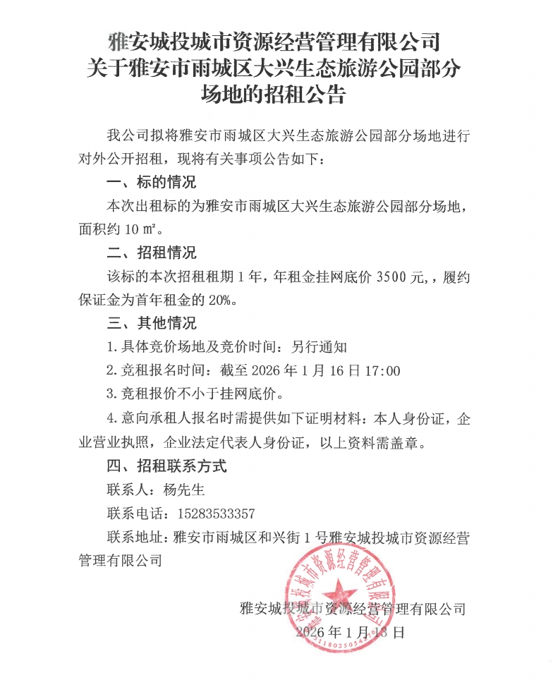 雅安城投城市資源經(jīng)營管理有限公司關于雅安市雨城區(qū)大興生態(tài)旅游公園部分場地的招租公告