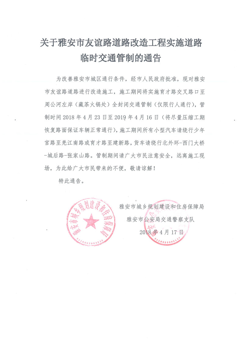 關(guān)于雅安市友誼路道路改造工程實(shí)施道路臨時(shí)交通管制的通告